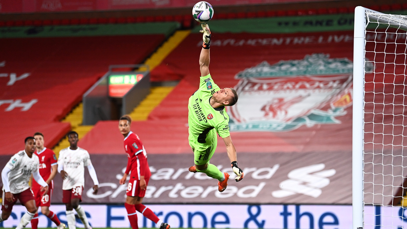 Arsenal goalkeeper Bernd Leno saved two penalties in a 5-4 shootout win over Liverpool to reach the League Cup quarterfinals on Thursday, while Aston Villa and Fulham were knocked out by lower-division clubs.