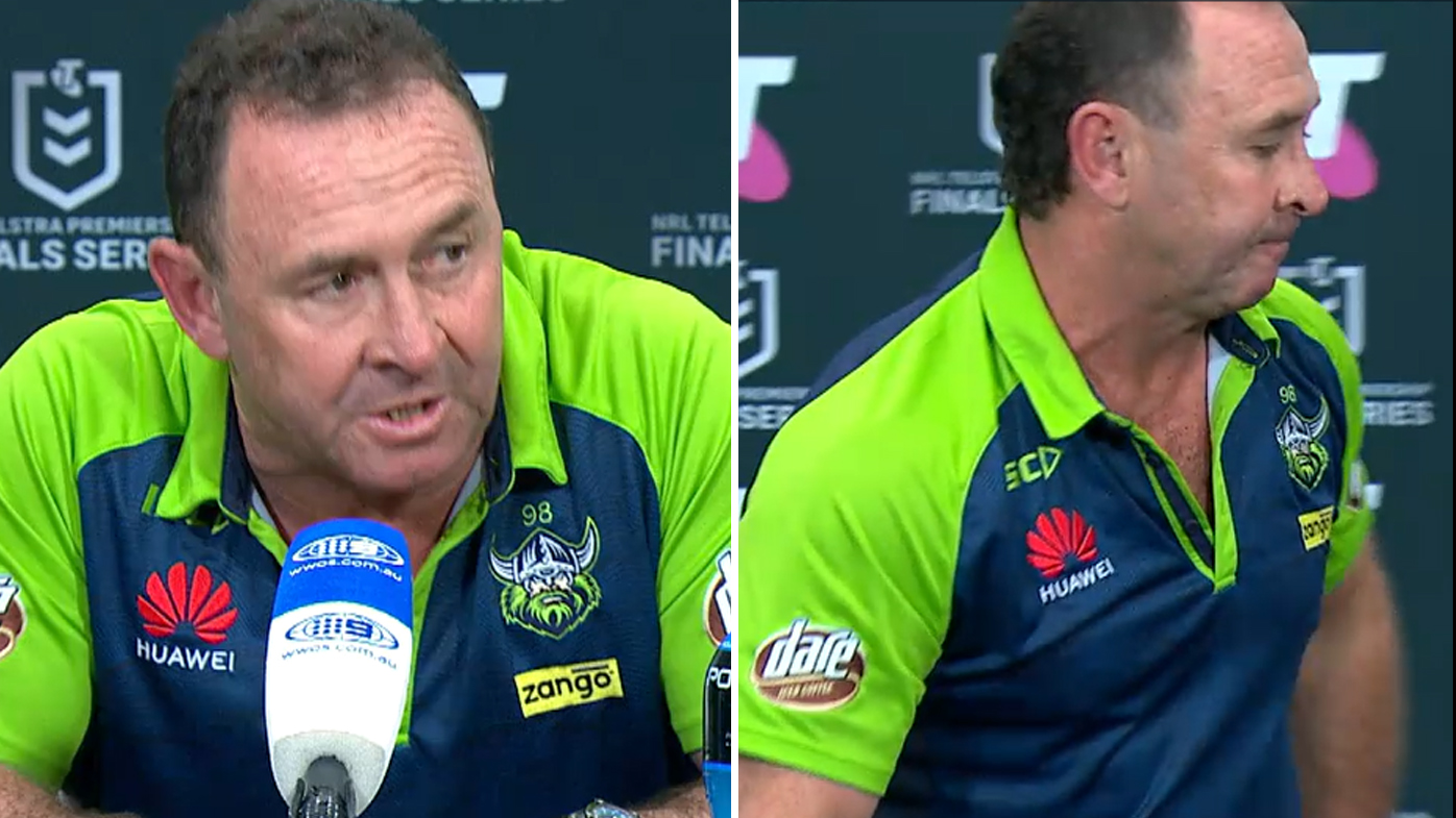 Canberra Raiders coach Ricky Stuart was in no mood for a long chat with media after his side's crushing 30-10 preliminary final loss to the Storm on Friday night.
